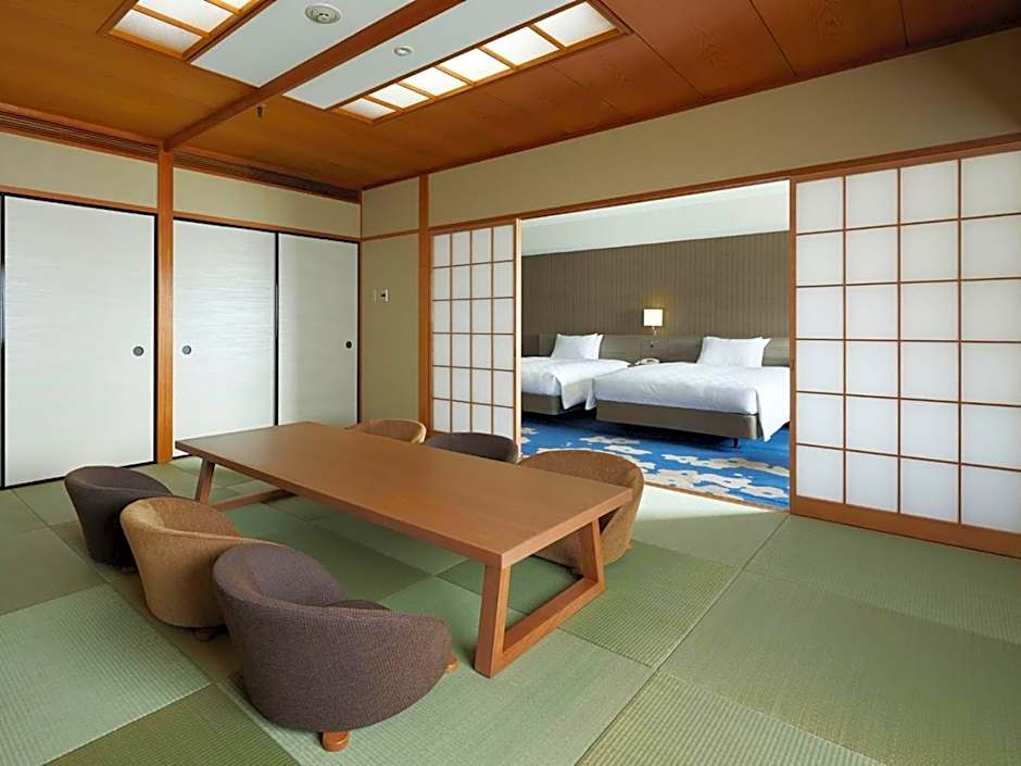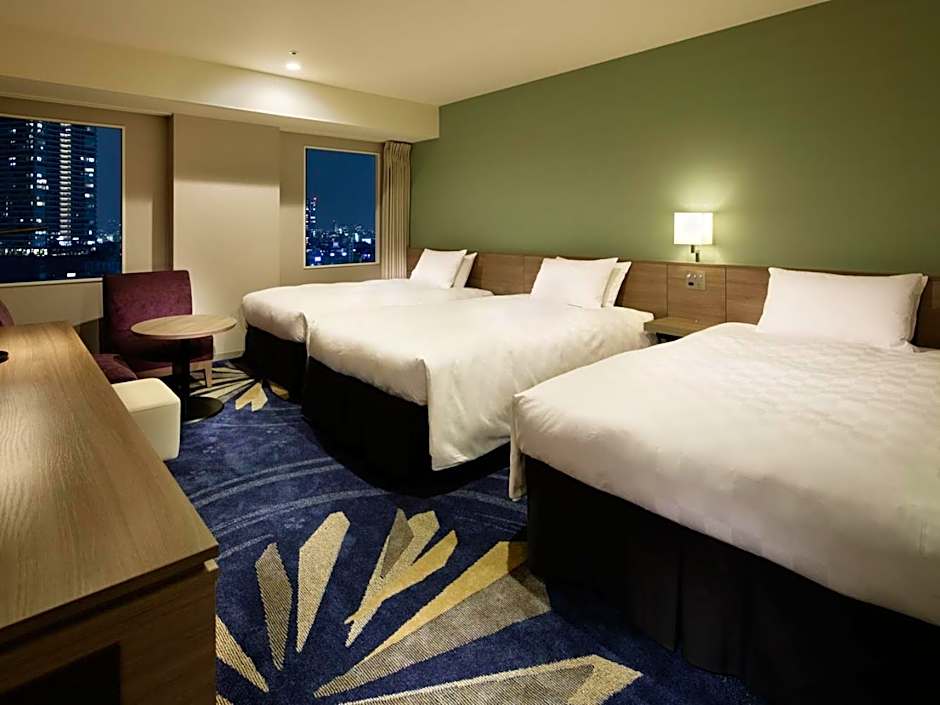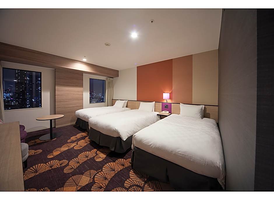 Japanese-Western style Room with Futon (11F-16F) (4 Pax) is 807 square feet and includes 4 single beds 80-130 width plus desk, hairdryer, safe, and slippers.